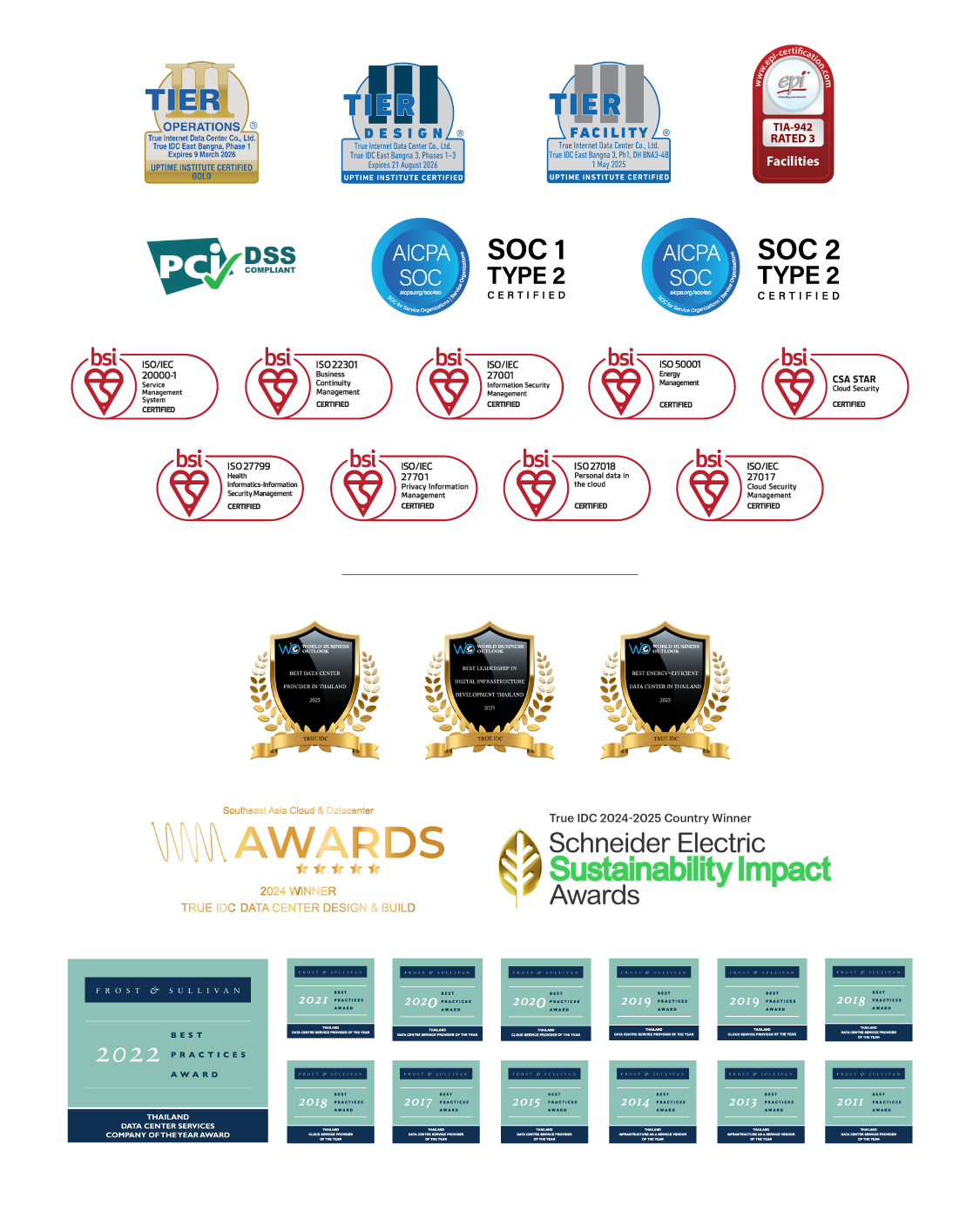True IDC sets the standard for Thailand's data center and Cloud industry by having the most number of internationally recognized certifications including ISO/IEC 20000-1, ISO/IEC 27001, ISO 22301, ISO 50001, ISO 27799, ISO27701, ISO27018, CSA-STAR Cloud Security, PCI-DSS, ISAE 3402 in SOC 2 Type II and is Thailand and Indochina's first data center to achieved all 3 certificates from Uptime Institute in Design Documents, Constructed Facility and Operational Sustainability.